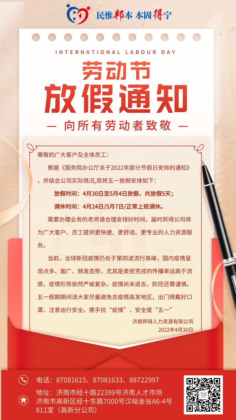 - 2024年5月濟(jì)南邦得人力資源有限公司高新分公司關(guān)于開展...
